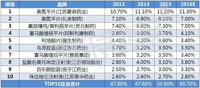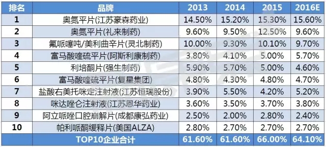 據(jù)中康CMH數(shù)據(jù)顯示,精神安定類藥物top10企業(yè)2015年市場規(guī)模達(dá)90.7億元,比2014年增長了11.9%,top10企業(yè)的市場份額合計占56.5%,表現(xiàn)出強(qiáng)大的競爭力。其中,江蘇豪森藥業(yè)以11.2%的市場份額名列第一。另外,在top10 企業(yè)中,外資企業(yè)占四個席位,分別為禮來制藥(第二)、靈北制藥(第三)、強(qiáng)生制藥(第五)、阿斯利康制藥(第七),內(nèi)資企業(yè)占有一定優(yōu)勢。