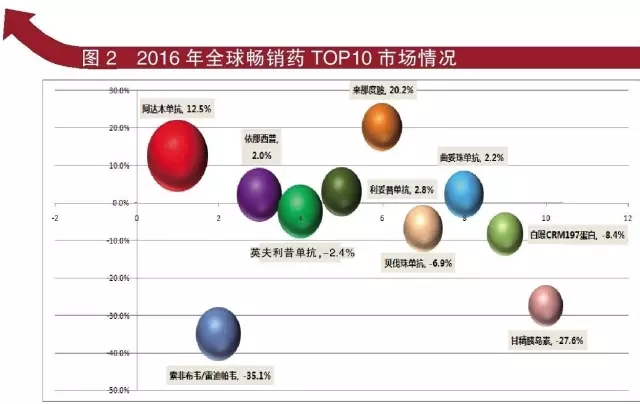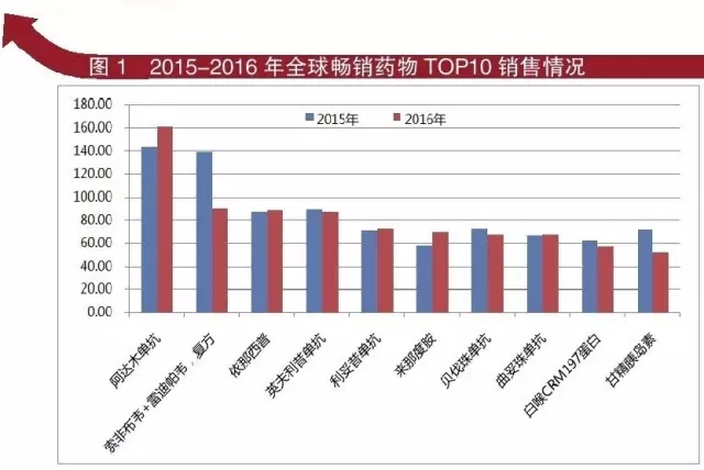 2016年全球暢銷藥物TOP 10分別是:Abbott(雅培)公司的阿達木單抗銷售額為160.78億美元,較同期增長12.5%;Gilead(吉利德)公司復方索非布韋/雷迪帕韋銷售額為90.00億美元,較同期下降35.1%;Amgen(安進)/Pfizer(輝瑞)公司依那西普銷售額為88.74億美元,較同期增長2.0%;Pfizer(輝瑞)公司的白喉CRM197蛋白銷售額為57.18億美元,較同期下降8.4%;Merck(默克)/Johnson & Johnson(強生)/Mitsubis公司英夫利昔單抗銷售額為87.00億美元,較同期下降2.4%;Roche(羅氏)/ Chugai(中外)公司有3個產品,利妥昔單抗銷售額為73.00億美元,較同期增長2.8%,貝伐珠單抗銷售額為67.83億美元,較同期下降6.9%,曲妥珠單抗銷售額為67.82億美元,較同期增長2.2%;Celgene(新基)公司的來那度胺銷售額為69.74億美元,較同期增長20.2%;Sanofi(賽諾菲)公司的甘精胰島素銷售額為52.00億美元,較同期下降27.2%。