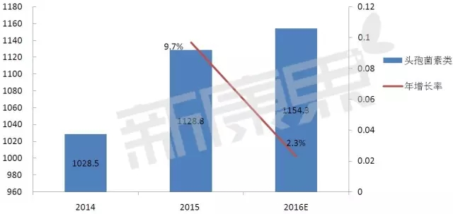 頭孢菌素又稱先鋒霉素,是一類廣譜半合成抗生素,第一個頭孢菌素于 20 世紀 60 年代問世,目前上市品種已達 60 余種。據(jù)中康CMH監(jiān)測數(shù)據(jù)顯示,2015年度全國抗生素銷售總額為1864.3 億元,其中頭孢菌素類銷售額為1128.8億元,占有60.5%的市場比重,市場規(guī)模同比增長9.7%,可見頭孢菌素類在抗生素市場地位之重。
