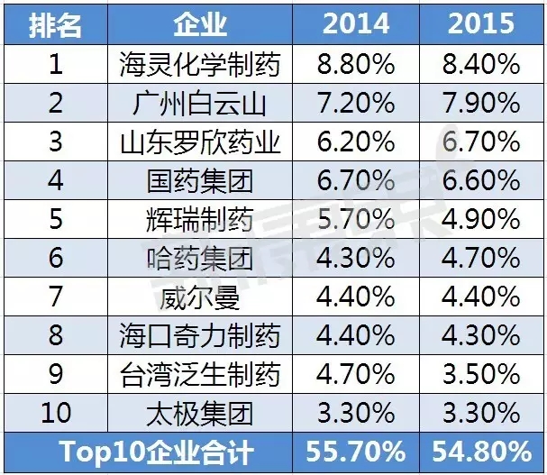 2015年度,第三代頭孢菌素前十企業(yè)總體規(guī)模為288.4億元,同比增長9.1%,合計份額為54.8%。海靈化學制藥以8.4%的占比排名榜首,廣州白云山和山東羅欣藥業(yè)緊隨其后。入圍Top10的外資企業(yè)僅輝瑞制藥和臺灣泛生制藥。