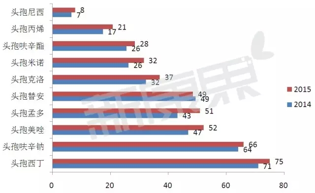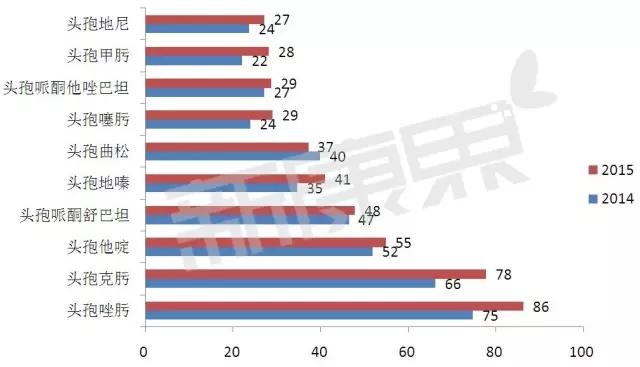 2015年度,第二代頭孢菌素總體規(guī)模為422.7億元,同比增長9.4%;其中頭孢西丁、頭孢呋辛鈉、頭孢美唑以及頭孢孟多市場規(guī)模均在50億元以上,合占比重57.8%以上。Top10中,頭孢米諾、頭孢丙烯和頭孢尼西同比增長較快,增幅在20%左右。