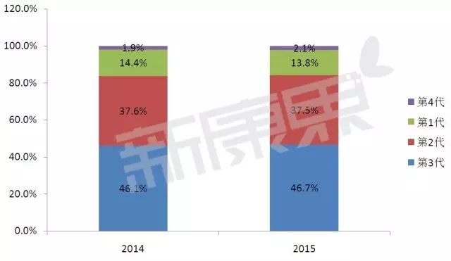 根據(jù)發(fā)明年代及抗菌性能的差異可將頭孢菌素劃分為第一代、第二代、第三代和第四代。據(jù)中康CMH監(jiān)測數(shù)據(jù)顯示,第三代和第二代頭孢菌素為目前市場中堅骨干力量,2015年度第三代頭孢菌素以幾近市場半壁江山的份額穩(wěn)居主導地位;緊隨其后的第二代也擁有37.5%的高份額。而從增長情況來看,則是第四代增速最快,增長率為22.2%。