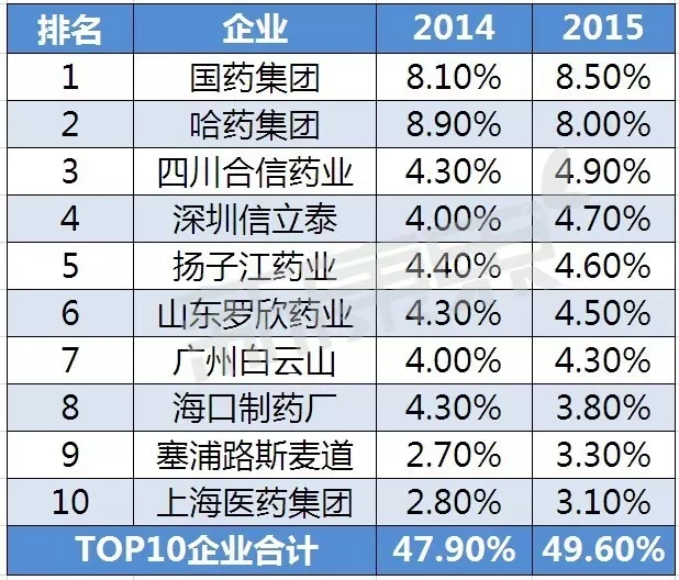 2015年度第二代頭孢菌素前十企業(yè)總體規(guī)模為209.8億元,同比增長13.5%,合計份額為49.6%。國藥集團和哈藥集團并駕齊驅(qū),以8%以上的占比拉開了與其余企業(yè)之間的距離。塞浦路斯麥道是唯一進入前十位行列的外資企業(yè)。