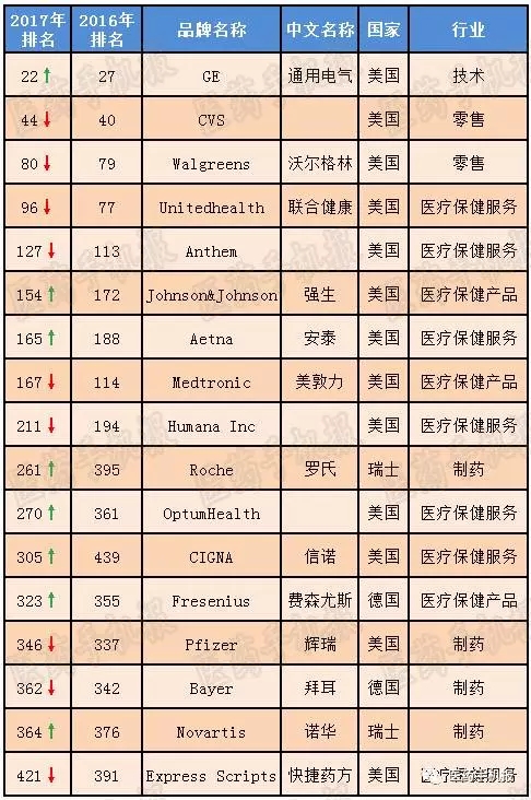在上述17家醫(yī)藥企業(yè)中,進(jìn)入百?gòu)?qiáng)的企業(yè)有4家,分別是GE(2017年品牌價(jià)值為353.18億美元)、CVS(232.86億美元)、沃爾格林(159.69億美元)、聯(lián)合健康(133.79億美元)。
