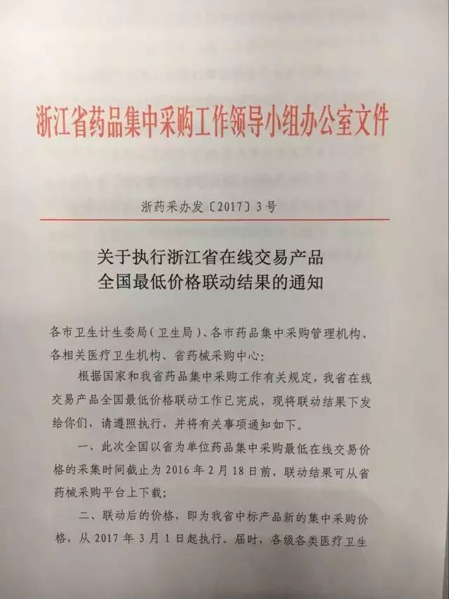 根據(jù)省藥品集中采購工作領(lǐng)導(dǎo)小組辦公室《關(guān)于執(zhí)行浙江省在線交易產(chǎn)品全國最低價格聯(lián)動結(jié)果的通知》(浙藥采辦發(fā)〔2017〕3號),以及浙江省省級醫(yī)療保險服務(wù)中心有關(guān)文件精神,現(xiàn)將我省在線交易產(chǎn)品執(zhí)行全國最低價聯(lián)動結(jié)果和2017年度醫(yī)保支付標(biāo)準(zhǔn)有關(guān)具體事項通知如下: