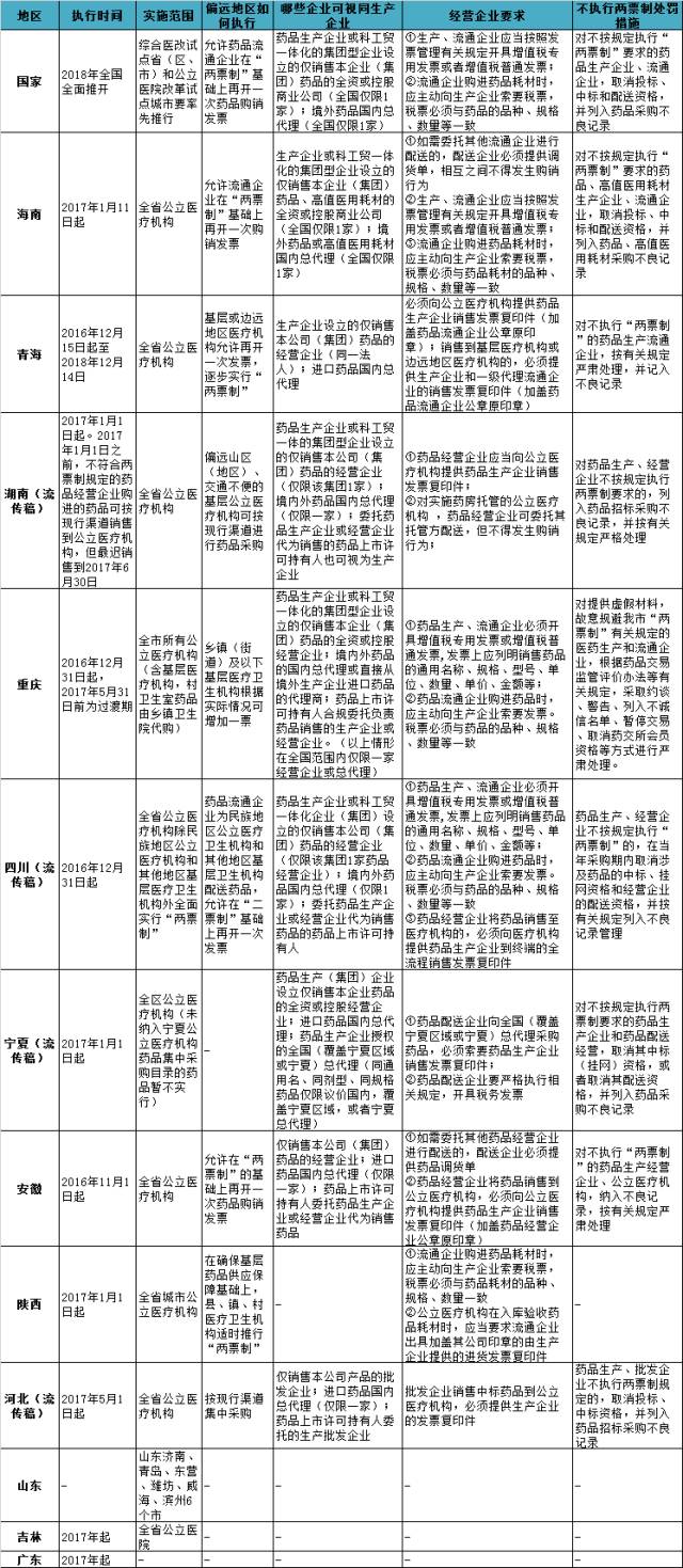 吉林:省衛(wèi)生計生委主任張義解讀《關于貫徹落實全國衛(wèi)生與健康大會精神加快衛(wèi)生與健康事業(yè)改革發(fā)展的實施意見》時提到2017年,全省全面推行公立醫(yī)院采購藥品“兩票制”,減少藥品流通環(huán)節(jié)。