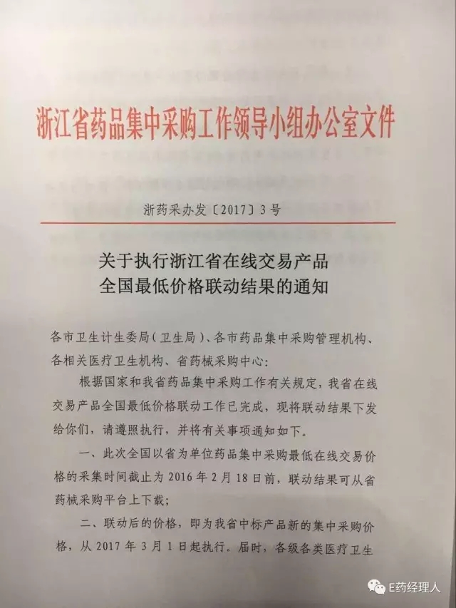 2017年2月21日,浙江省藥械采購中心公布了《關(guān)于執(zhí)行浙江省在線交易產(chǎn)品全國最低價(jià)格聯(lián)動(dòng)結(jié)果的通知》,公布了8290種藥品的全國最低價(jià)聯(lián)動(dòng)結(jié)果,不過產(chǎn)品的價(jià)格已經(jīng)低于企業(yè)預(yù)期。放棄還是接受,將是企業(yè)需要考慮的首要問題。