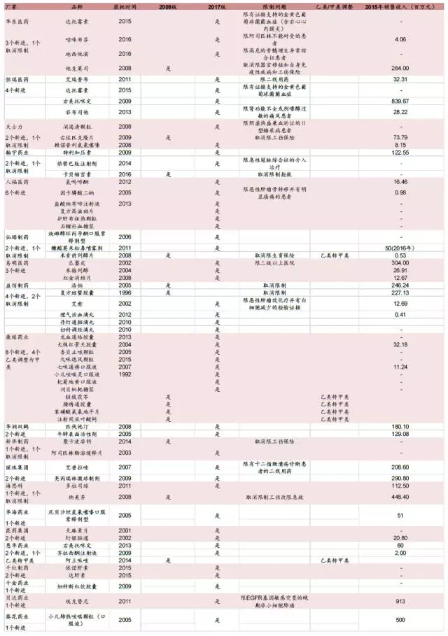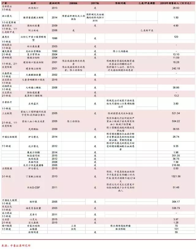 2017版醫(yī)保目錄共有2535個品種,較2009版的2196個增加296個,增幅15.4%。其中西藥1297 個品種增加133個,中藥1150個品種增加了163個,民族藥88個增加43個。品種總數(shù)符合預期,多數(shù)公司的多數(shù)重點品種納入了這一版醫(yī)保目錄,專家同步評審確定了45個擬談判藥品,下一步將通過談判適當降低價格后再納入目錄。