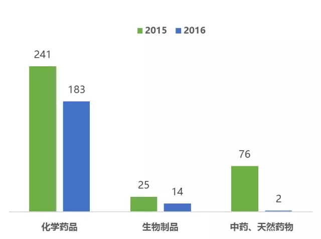根據(jù)CFDA先后發(fā)布的上市藥品公告及企業(yè)公告,2016年國內(nèi)上市化學(xué)藥品共183個(按受理號計),生物制品14個,中藥、天然藥物2個。相比2015年均有所下降。特別值得一提的是,受臨床自查及一致性評價的影響,2016年化學(xué)藥品批準(zhǔn)文號中大多數(shù)為原料藥和注射劑,僅有6個口服固體制劑。