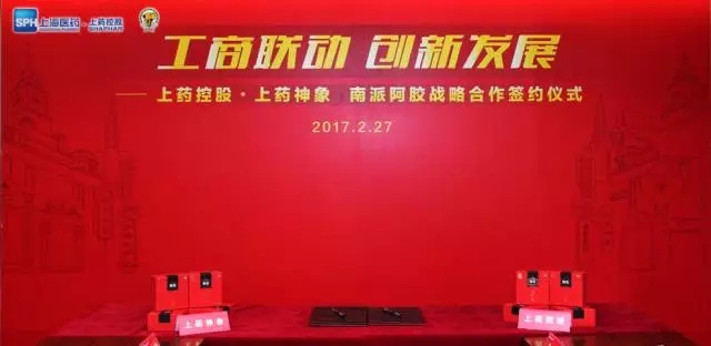 2017年2月27日,上藥控股和上藥神象在滬舉行“南派阿膠戰(zhàn)略合作”簽約儀式,雙方就該項目達成了長期合作意向、結成全面戰(zhàn)略伙伴關系。