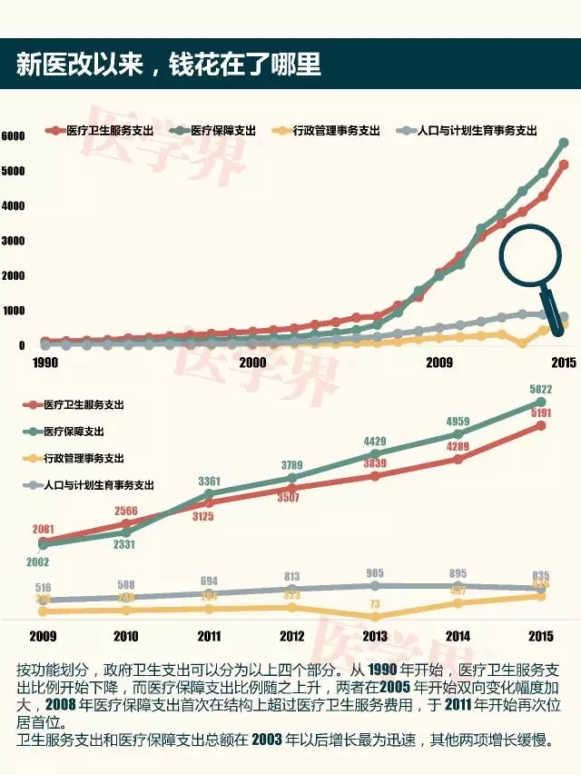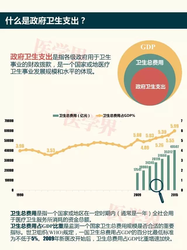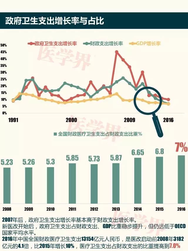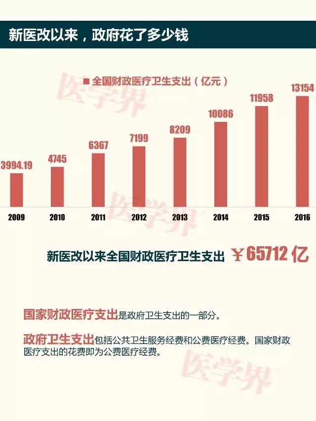 近日,中國(guó)財(cái)政部社會(huì)保障司有關(guān)負(fù)責(zé)人表示,2016年中國(guó)全國(guó)財(cái)政醫(yī)療衛(wèi)生支出(含計(jì)劃生育)13154億元人民幣,是醫(yī)改啟動(dòng)前2008年3182億元的4.1倍,比2015年增長(zhǎng)10%,醫(yī)療衛(wèi)生支出占財(cái)政支出的比重提高到7.0%。但是當(dāng)前及今后一段時(shí)期,在GDP增速放緩的情況下,衛(wèi)生總費(fèi)用不能再繼續(xù)維持前幾年的高速增長(zhǎng),否則將導(dǎo)致醫(yī)療衛(wèi)生制度不可持續(xù)。新醫(yī)改八年花了多少錢,這些錢花在了哪里?醫(yī)學(xué)界智庫(kù)用一圖讀懂來(lái)告訴你。