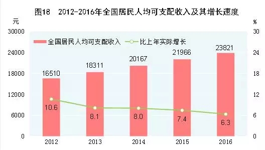 全年全國居民人均可支配收入23821元,比上年增長8.4%,扣除價(jià)格因素,實(shí)際增長6.3%;全國居民人均可支配收入中位數(shù)20883元,增長8.3%。按常住地分,城鎮(zhèn)居民人均可支配收入33616元,比上年增長7.8%,扣除價(jià)格因素,實(shí)際增長5.6%;城鎮(zhèn)居民人均可支配收入中位數(shù)31554元,增長8.3%。農(nóng)村居民人均可支配收入12363元,比上年增長8.2%,扣除價(jià)格因素,實(shí)際增長6.2%;農(nóng)村居民人均可支配收入中位數(shù)11149元,增長8.3%。按全國居民五等份收入分組,低收入組人均可支配收入5529元,中等偏下收入組人均可支配收入12899元,中等收入組人均可支配收入20924元,中等偏上收入組人均可支配收入31990元,高收入組人均可支配收入59259元。貧困地區(qū)農(nóng)村居民人均可支配收入8452元,比上年增長10.4%,扣除價(jià)格因素,實(shí)際增長8.4%。全國農(nóng)民工人均月收入3275元,比上年增長6.6%。