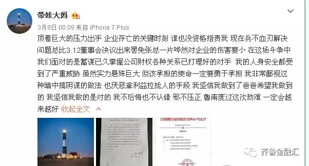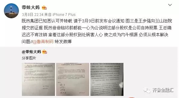 3月8日凌晨,最早曝出魯南制藥集團(tuán)三份材料的微博博主“帶娃大媽”再次發(fā)布消息稱:“頂著巨大的壓力出手,企業(yè)存亡的關(guān)鍵時(shí)刻,誰也沒資格指責(zé)我?,F(xiàn)在兵不血刃解決問題總比3.12董事會(huì)決議出來罷免張總一片嘩然對(duì)企業(yè)的傷害要小。在這場(chǎng)斗爭(zhēng)中,我們面對(duì)的是蓄謀已久掌握公司財(cái)權(quán)各種關(guān)系已打理好的對(duì)手,我的人身安全都受到了嚴(yán)重威脅,雖然實(shí)力懸殊巨大,但該承擔(dān)的使命一定要勇于承擔(dān)。我非常鄙視這種暗中搞陰謀的做法,也厭惡拿利益拉攏人的手段。我堅(jiān)信我做到了爸爸希望我做到的,我堅(jiān)信我做的是對(duì)的,我不后悔也不認(rèn)錯(cuò)。邪不壓正,魯南度(渡)過這次劫難,一定會(huì)越來越好。”