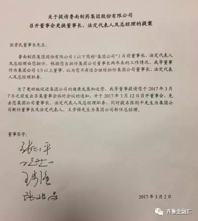 通過查閱魯南制藥集團(tuán)相關(guān)資料,上述人名均對(duì)應(yīng)著該集團(tuán)的核心高管和股東。其中,趙龍為前董事長(zhǎng)趙志全的女兒,簽名罷免董事長(zhǎng)提議的四位董事分別為:集團(tuán)副總經(jīng)理張則平,副總經(jīng)理李冠忠,副總經(jīng)理兼總會(huì)計(jì)師王步強(qiáng),副總經(jīng)理張理星。