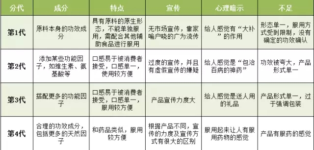 這一代保健食品的代表產品包括:硫酸軟骨素膠囊、葡萄籽膠囊、輔酶Q10片劑等。表1總結了上述4代產品的特點。