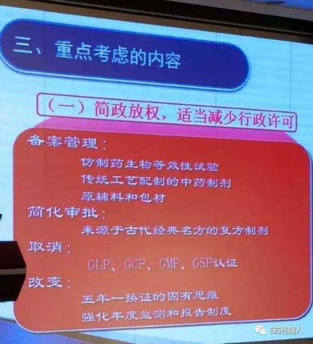 上述人士在會上表示,在目前正在進(jìn)行修訂的新版《藥品管理法》,簡政放權(quán)、適當(dāng)減少行政許可是修訂的主導(dǎo)方向,其中有一些內(nèi)容目前已基本確定,其中包括GLP、GCP、GSP、GMP認(rèn)證的取消。