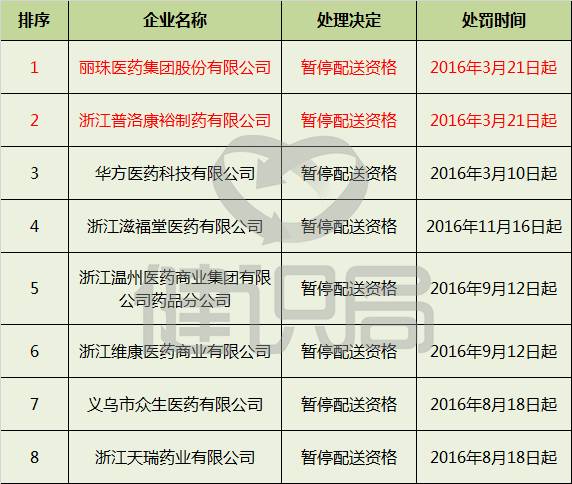 浙江省藥械采購中心發(fā)布的《2016年第四季度藥品配送率低于60%配送企業(yè)處理結(jié)果》,因企業(yè)業(yè)務(wù)調(diào)整等原因,自2017年3月21日起暫停麗珠醫(yī)藥集團股份有限公司和浙江普洛康裕制藥有限公司自行配送資格。