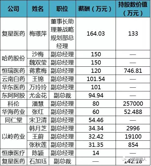 此外還有三位超過百萬年薪者。分別是恒瑞醫(yī)藥副總經(jīng)理蔣素梅、云南白藥副總經(jīng)理王錦、華東醫(yī)藥副總經(jīng)理萬玲玲。