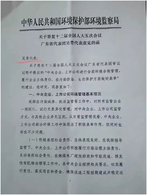 3月16日晚,吳青表示自己已收到了環(huán)保部環(huán)境監(jiān)察局3月13日答復(fù)其意見的函件。