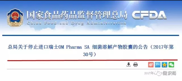 國家食品藥品監(jiān)督管理總局決定停止瑞士OM Pharma SA的細(xì)菌溶解物膠囊進(jìn)口,要求各口岸食品藥品監(jiān)督管理局停止瑞士OM Pharma SA細(xì)菌溶解物膠囊的進(jìn)口通關(guān)備案。