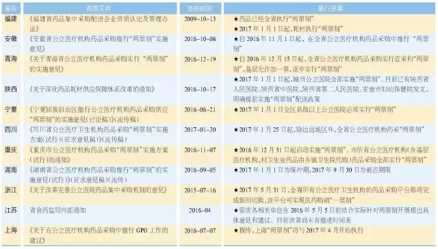 在國家版實施意見(國醫(yī)改辦4號文)出臺之前,不少省份就開始了對“兩票制”的探索。醫(yī)改標桿省份安徽率先垂范,自2016年11月起就在省內(nèi)所有公立醫(yī)療機構(gòu)推開兩票制。目前來看,“兩票制”已基本進入其余各醫(yī)改試點省份的推進時間表。