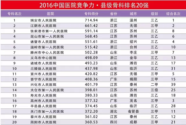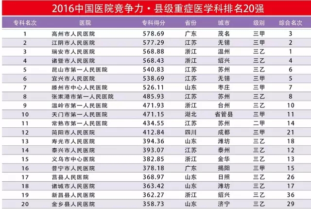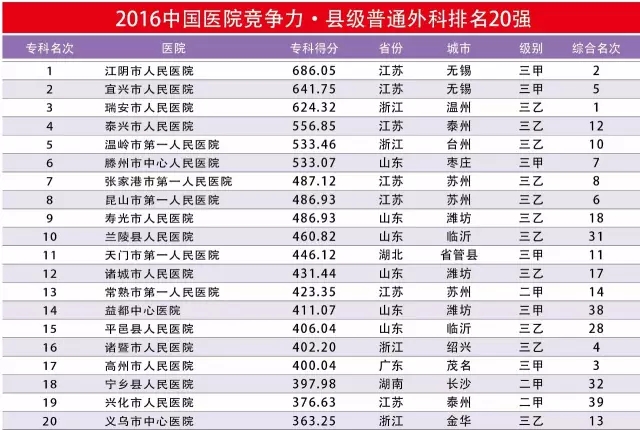 這是中國史上首次對中國縣級醫(yī)院專科,含外科系列:普通外科、骨科、泌尿外科、神經(jīng)外科、ICU、婦產(chǎn)科,內(nèi)科系列心血管內(nèi)科、呼吸內(nèi)科、消化內(nèi)科、神經(jīng)內(nèi)科、腫瘤科、兒科進行排名評價。并且我們發(fā)現(xiàn),縣級外科20強所屬醫(yī)院,主要分布在江蘇、山東、浙江、廣東、湖北、湖南、四川、吉林這8個省份。