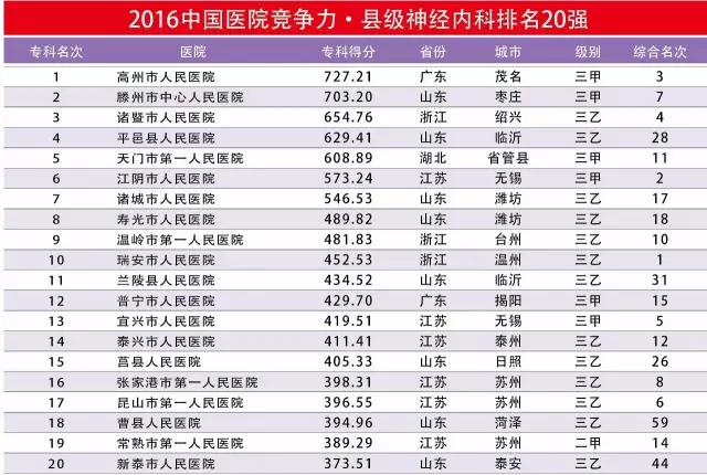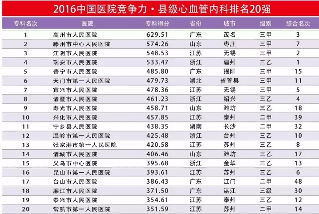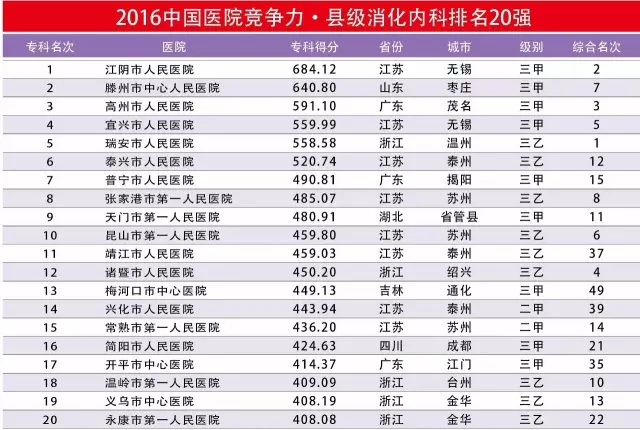 縣級內(nèi)科20強均來自縣級醫(yī)院綜合排名的前60強,來自江蘇、山東、浙江、廣東、湖北、四川、湖南、廣西、河北、吉林十個省份;