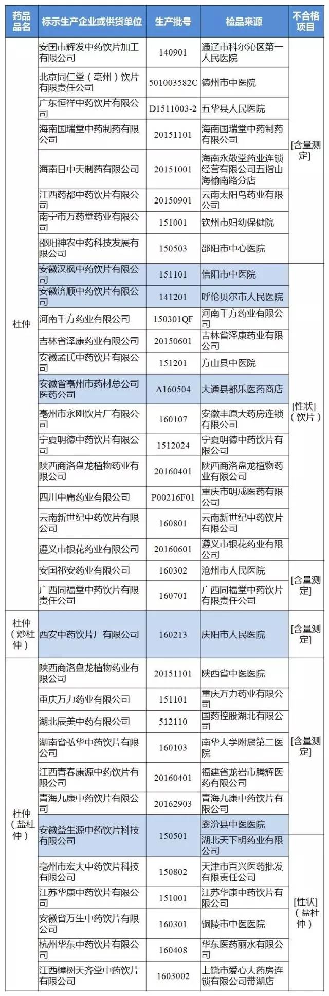 經(jīng)陜西省食品藥品檢驗所檢驗,標示為安國祁安藥業(yè)有限公司、安國市輝發(fā)中藥飲片加工有限公司、吉林省澤康藥業(yè)有限公司、江蘇華康中藥飲片有限公司、杭州華東中藥飲片有限公司、安徽省萬生中藥飲片有限公司、安徽孟氏中藥飲片有限公司、北京同仁堂(亳州)飲片有限責任公司、亳州市永剛飲片廠有限公司、亳州市宏大中藥飲片科技有限公司、江西青春康源中藥飲片有限公司、江西藥都中藥飲片有限公司、江西樟樹天齊堂中藥飲片有限公司、河南千方藥業(yè)有限公司、湖北辰美中藥有限公司、湖南省弘華中藥飲片有限公司、邵陽神農(nóng)中藥科技發(fā)展有限公司、廣東恒祥中藥飲片有限公司、廣西同福堂中藥飲片有限責任公司、南寧市萬藥堂藥業(yè)有限公司、海南國瑞堂中藥制藥有限公司、海南日中天制藥有限公司、重慶萬力藥業(yè)有限公司、四川中庸藥業(yè)有限公司、遵義市銀花藥業(yè)有限公司、云南新世紀中藥飲片有限公司、陜西商洛盤龍植物藥業(yè)有限公司、青海九康中藥飲片有限公司、寧夏明德中藥飲片有限公司等企業(yè)生產(chǎn)的35批次杜仲不合格。不合格項目包括含量測定、性狀。
