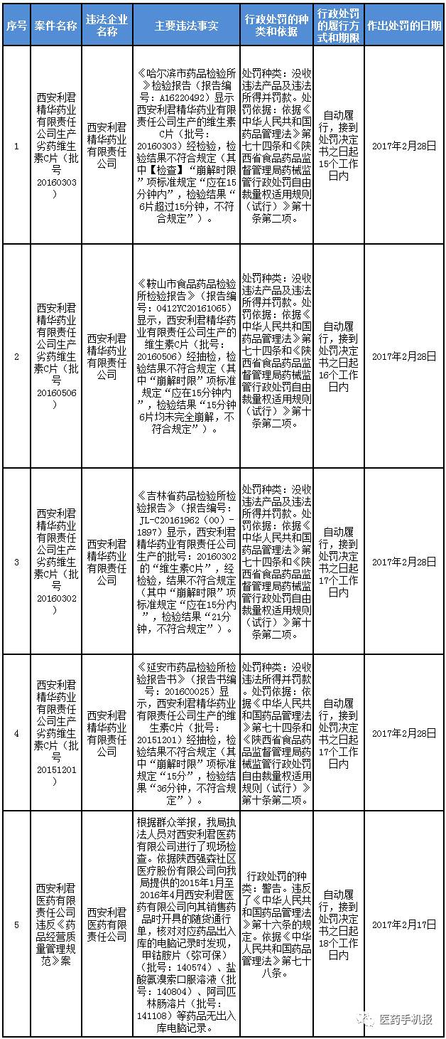 具體來(lái)看,西安利君精華藥業(yè)有限責(zé)任公司涉及4起案件,分別是生產(chǎn)不同批次的劣藥維生素C片;西安利君醫(yī)藥有限責(zé)任公司則因違反《藥品經(jīng)營(yíng)質(zhì)量管理規(guī)范》,被警告。