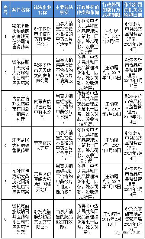 具體來(lái)看,甘肅普爾康藥業(yè)有限公司、甘肅森源藥業(yè)科技有限責(zé)任公司、隴西縣鵬飛藥業(yè)有限責(zé)任公司因生產(chǎn)劣藥被行政處罰;隴西縣一方制藥有限公司則因購(gòu)進(jìn)不合格中藥材被行政處罰。