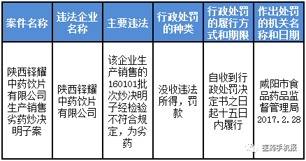 3月22日,陜西省咸陽(yáng)市藥監(jiān)局發(fā)布《行政處罰案件信息公開(kāi)表》,公開(kāi)9起行政處罰案件,其中有1起涉及藥品生產(chǎn)經(jīng)營(yíng)企業(yè),為陜西鐸耀中藥飲片有限公司生產(chǎn)銷售劣藥炒決明子案。
