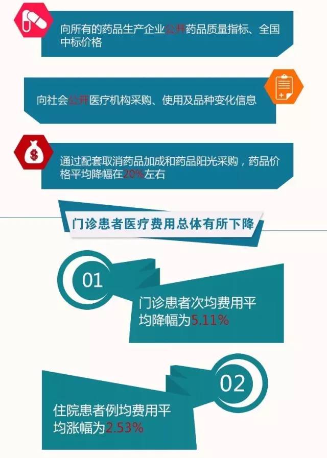 通過配套取消藥品加成和藥品陽光采購,藥品價格平均降幅在20%左右。短期看,不同患者費(fèi)用有升有降,不太均衡,但從長期看,最終是讓百姓受益。