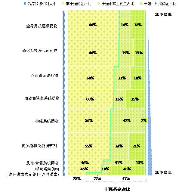 2016年主要治療領(lǐng)域中十強(qiáng)制藥企業(yè)集中度