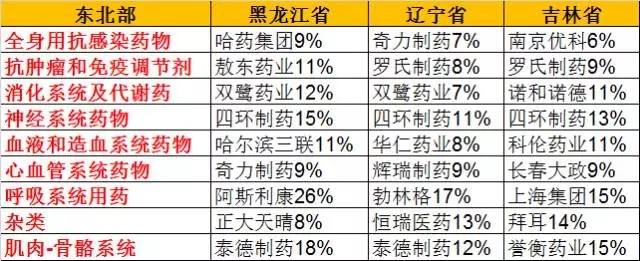 2016年主要治療領(lǐng)域重點省(區(qū)、市)采購額排名第一的制藥企業(yè)(東北部地區(qū))