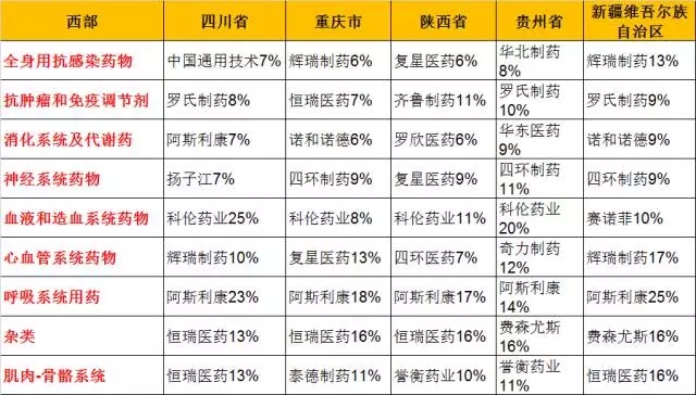 2016年主要治療領(lǐng)域重點省(區(qū)、市)采購額排名第一的制藥企業(yè)(西部地區(qū))
