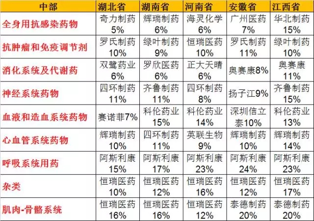2016年主要治療領(lǐng)域重點?。▍^(qū)、市)采購額排名第一的制藥企業(yè)(中部地區(qū))