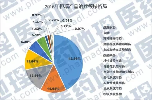 恒瑞銷售占比最大的一類為抗腫瘤藥42.96% ,排名第二的是雜類,占比14.64%,精神障礙用藥排名第三占比14%,麻藥占接近12%。相對來說,恒瑞的產(chǎn)品線分布領(lǐng)域更加廣泛,銷售額排名前五的治療類別也都是近些年來增長趨勢明顯的領(lǐng)域。