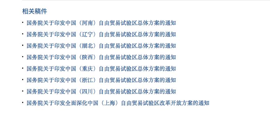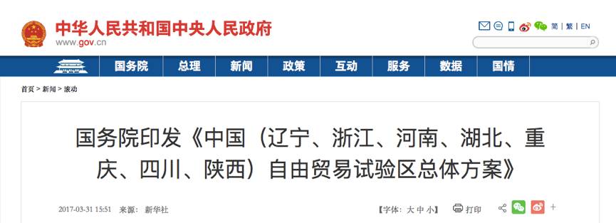 昨日(30日),國務(wù)院分別印發(fā)遼寧、浙江、河南、湖北、重慶、四川和陜西七省市自由貿(mào)易試驗(yàn)區(qū)總體方案(以下統(tǒng)稱《總體方案》)。
