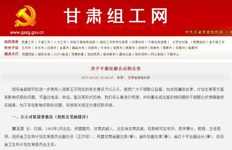 據(jù)公開資料顯示,即將接任甘肅省衛(wèi)計委主任的郭玉芬,出生于1962年,甘肅武威人,現(xiàn)任甘肅省衛(wèi)計委副主任。郭玉芬曾在醫(yī)院任職長達25年,2008年3月赴甘肅省衛(wèi)生廳任副廳長,5年后任甘肅省衛(wèi)計委副主任(正廳級),至今已有3年多。