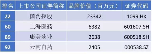 總榜Top100中,醫(yī)藥生物行業(yè)共有4家企業(yè)上榜,數(shù)量位列全部27個(gè)小類(lèi)別的第9名,4家企業(yè)分別是國(guó)藥控股、上海醫(yī)藥、康美藥業(yè)和云南白藥。