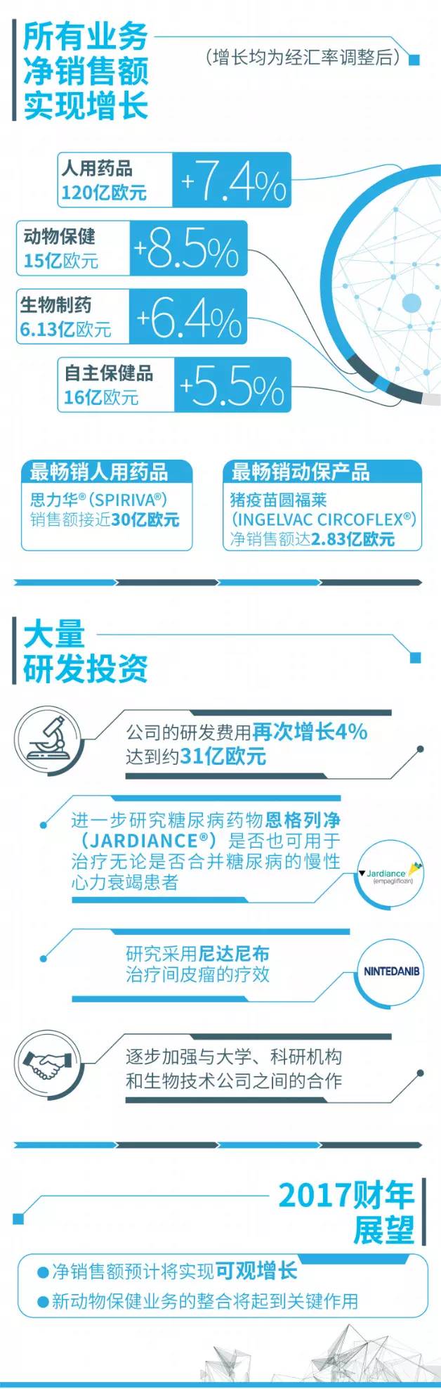 在過去130多年里,研究型制藥公司勃林格殷格翰一直致力于為人類與動物帶來創(chuàng)新的藥物。勃林格殷格翰公司是全球前20大制藥企業(yè)之一,至今仍是家族企業(yè)。每天,在人用藥品、動物保健和生物制藥合同制造三個業(yè)務(wù)領(lǐng)域,約5萬名員工都在努力通過創(chuàng)新展現(xiàn)價值。2016年,勃林格殷格翰公司實現(xiàn)凈銷售額約159億歐元。研發(fā)支出超過30億歐元,相當(dāng)于凈銷售額的19.6%。