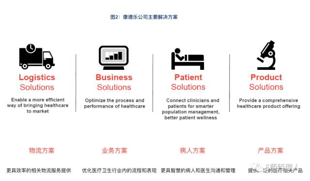 同樣地,另一個(gè)美國醫(yī)藥商業(yè)巨頭康德樂公司也將其業(yè)務(wù)描述定位在“能夠幫助客戶在變化中的環(huán)境中茁壯成長的眾多解決方案”之中。2017年初,在JP摩根投資者大會(huì)上,康德樂公司將這樣的解決方案詮釋為物流方案,業(yè)務(wù)方案,病人方案和產(chǎn)品方案這4個(gè)組成部分。