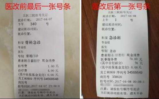 凌晨00:08,北醫(yī)三院急診系統(tǒng)開出了第一張?zhí)枟l,新號(hào)條上掛號(hào)費(fèi)一項(xiàng)已經(jīng)消失,取而代之的是醫(yī)事服務(wù)費(fèi),金額為70元,而零點(diǎn)前急診開出的最后一張?zhí)枟l則為:掛號(hào)費(fèi)1元,診療費(fèi)4元。