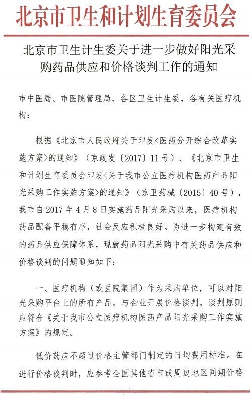 今日(4月13日),北京衛(wèi)計(jì)委下發(fā)關(guān)于進(jìn)一步做好陽光采購藥品供應(yīng)和價(jià)格談判工作的通知。