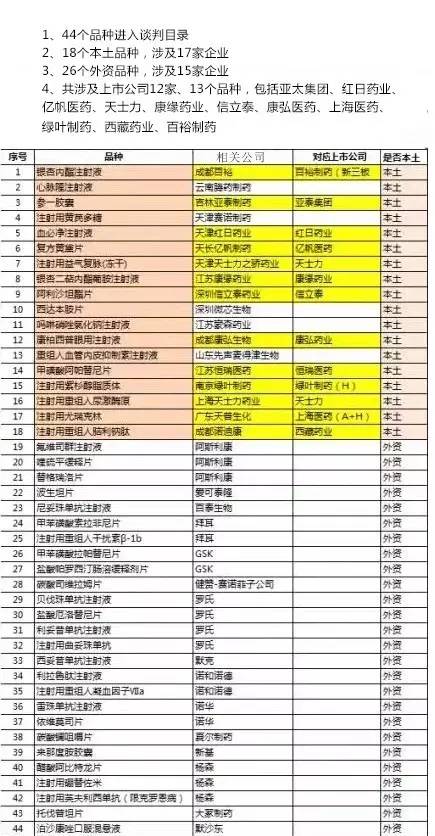 這一名單也迅速終結(jié)了此前市場對這份擴大版“醫(yī)保市場“的種種猜想——44個品種包括本土18個,外資26個;對應(yīng)了17家本土制藥公司和15家外資企業(yè),總計32家藥企入圍。