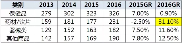據(jù)中康CMH數(shù)據(jù),2016年零售藥店中非藥品銷售規(guī)模930億元,同比增長11.7%,較2015年增速(5.1%)擴大近1.3倍,再次反超藥品增速(8.3%)。分析顯示,這主要得益于中藥材和中藥飲片的大幅增長——2015年,中藥材和中藥飲片的增速為-2.5%,2016年該數(shù)字大幅升高至31.1%。