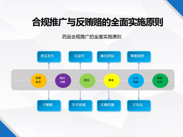 藥品合規(guī)推廣的全面實施原則,面向醫(yī)院、醫(yī)生、政府官員要遵循無誤導(dǎo)、真實發(fā)生、學(xué)術(shù)依據(jù)、不賄賂的原則;對患者、公共傳媒、競爭對手要以最佳立意、規(guī)則、正確傳播、不攻擊為重。