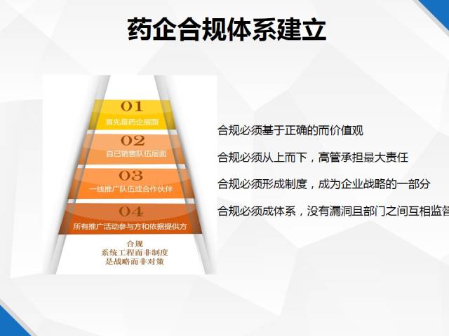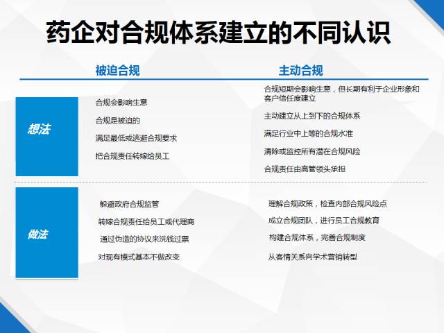 當(dāng)前藥企對合規(guī)體系有兩種不同的認識,主動合規(guī)和被迫合規(guī)。一種認為合規(guī)限制的生意的發(fā)展,影響了市場,于是想盡各種辦法,通過偽造協(xié)議、轉(zhuǎn)嫁責(zé)任等方式躲避合規(guī)監(jiān)管。主動合規(guī)的藥企認為長期有利于企業(yè)形象和客戶信任度建立,因此營銷重心從客情關(guān)系向?qū)W術(shù)營銷轉(zhuǎn)型,構(gòu)建合規(guī)體系,完善合規(guī)制度。