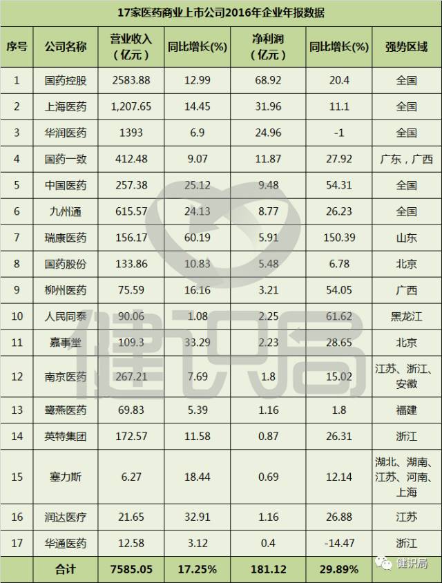 健識君梳理發(fā)現(xiàn), 17家醫(yī)藥商業(yè)公司在2016年的總營收已突破7585.05億元,同比漲幅超過17.25%。根據(jù)商務(wù)部統(tǒng)計,2015年,全國藥品流通直報企業(yè)主營業(yè)務(wù)收入12625億元,扣除不可比因素同比增長10.9%。這幾家商業(yè)公司平均增長顯然還是不錯的。