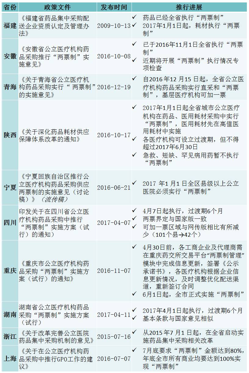 “衛(wèi)計(jì)委專題工作座談會(huì)”再提“兩票制”時(shí)間表,也是衛(wèi)生線對(duì)醫(yī)改重點(diǎn)工作的督辦。從11個(gè)醫(yī)改試點(diǎn)省份的“兩票制”推進(jìn)情況看,截至4月27日,已有福建、安徽、陜西、重慶、青海、四川、湖南共7個(gè)省市出臺(tái)正式實(shí)施方案,寧夏仍停留于網(wǎng)傳版內(nèi)部討論稿階段,江浙滬雖未發(fā)布“兩票制”正式文件,但均未停止醫(yī)藥流通領(lǐng)域相關(guān)改革。據(jù)了解,上海已有多家醫(yī)院開(kāi)始對(duì)自身“兩票”與“非兩票”品種進(jìn)行梳理、篩選,以承接“兩票制”政策。此外,非醫(yī)改試點(diǎn)省遼寧、甘肅、海南也正式發(fā)布了“兩票制”方案。
